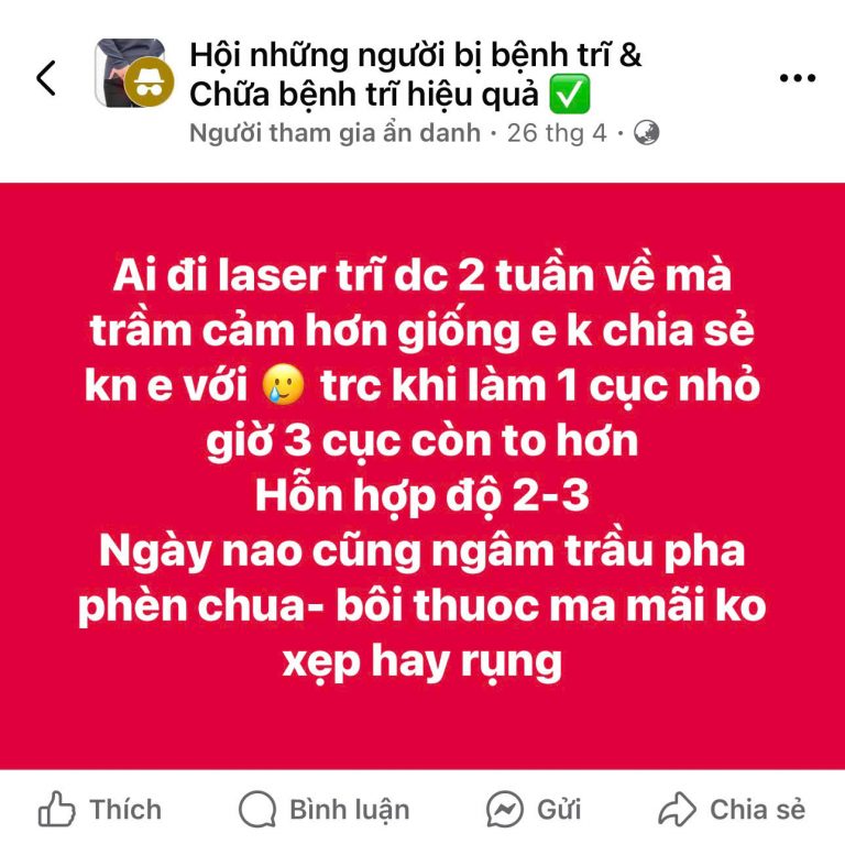 - Phục hồi không nhanh như kỳ vọng: Nhiều người vẫn phải nghỉ dưỡng 1–2 tuần vì hậu môn sưng đau, chảy dịch, khó chịu khi vận động, thay vì có thể sinh hoạt bình thường chỉ sau vài ngày như mong đợi.
